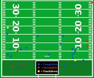 Aside from John's design from year to year, you may notice a similar high volume under five yards and an identical number of passes beyond 10 yards. Brady has a similar chart every week, but I guess (in our heads) we see him throwing bomb after bomb, or something.