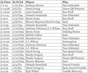 And finally, this week's "David Irving is playing at an unfair level" play of the week. Poor 75-Larry Warford is victim of the push-pull technique and then Irving is by in a flash and doing his thing, which, as you know by now, is not to get a sack. It is to knock the ball loose while getting a sack.