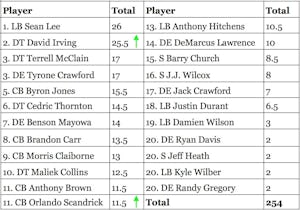 But, that 2011 team used 19.5 from Ware to stack its total high. The Cowboys have 34 this year, but have nobody with more than 6. Benson Mayowa is at 6, Maliek Collins is at 5, Tyrone Crawford at 4.5, and now David Irving is at 4. This is pretty stacked with a number of rushers from different places, and none of them mentioned were DeMarcus Lawrence (1 sack) or Randy Gregory (0). Those two have had the biggest draft-day investment, but for a number of reasons which are pretty well documented, they have not really joined the party yet.