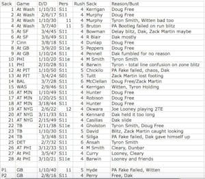 6) - As you would expect, the majority of these were in shotgun and 13 were on 3rd downs. There were several play-action plays where the defense was sitting on the fake, and there were a number of occasions where Dak Prescott caused his own sack by taking too long to abort the broken down play.