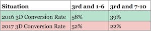 Last year, they ranked 10th in the league at 42.3 percent. They also faced 11.8 third-down situations a game which was the fourth fewest in the league. What is the best way to win third downs? Never to face them. This year, they are back at 15th in the number of 3rd downs they face. And that is where they get in trouble.