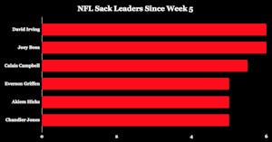 Speaking of Carolina, the Panthers show up in another stat that should also give you some optimism about the Cowboys' defense: Since Week 5, when Irving returned from his suspension and joined Lawrence to form quite a formidable pass rush, these are the NFL's team sack leaders (that included a bye week for Dallas):