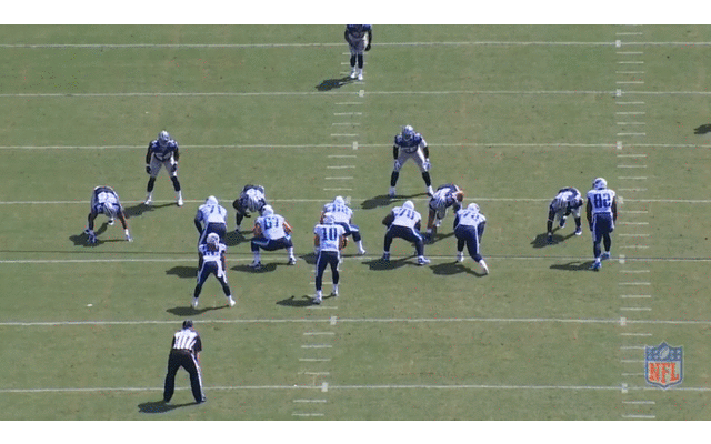 Above, the Cowboys get a sack before halftime in Nashville with the ideal 4-man rush against 5 OL. This is the nickel pass rush in a nutshell. Put two threats at DT who can each rush, line them up on the outside shoulder of the guard and make the center choose which way he is going to try to help. Whichever he chooses, the other side gets 2 on 2 in space. In this spot, Melton is up on LG 67-Andy Levitre and Kyle Wilber has LT 71-Michael Roos. You may not know this, but Wilber can really rush the passer. Maybe the 2014 version of Victor Butler as a guy that can move the needle big time with a nice edge move, but cannot do enough things to be a regular in the defense. Here, Melton and Wilber both get wins, and when Locker doesn't get the ball out, they meet at the QB for a half-sack each. Nice job here by the front 4 getting home. They just didn't do this enough.