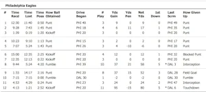 Below is one of the most amazing drive charts you will ever see. It is the details of the Eagles drives from Sunday where the Eagles finally snapped a play over midfield at the 9:03 left in the 3rd Quarter. The first half totaled 5 drives, 16 plays, 1 first down, and 22 yards of total offense. Simply put, total and utter domination: