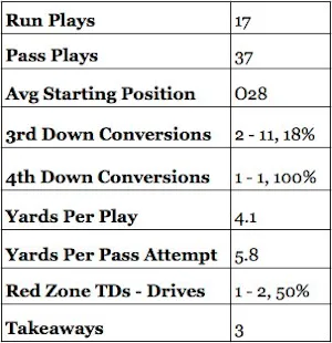 Here we see the details of a great day for the defense. They took the ball away multiple times, they did not allow 3rd down success, they stopped them through the air and on the ground.
