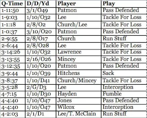 Now, note all of the plays behind the line of scrimmage. Look at how Sean Lee racked up 5 different big plays and set the pace, but let's not overlook the play of the DL and Jeremy Mincey in particular. On several occasions, his penetration allowed Lee and Barry Church to run free and past DeMarco Murray in the backfield. It was a really impressive job. Of course, for DBs, there is an issue with splash plays because if they never throw at you, you can't make a play. If they do pick on you, you have more opportunities, but it doesn't mean you are a better player. Sterling Moore had many splashes last year and Tyler Patmon is now taking that target. So far, Patmon is standing up.