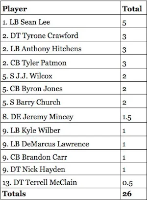 Here are the season totals and you can see that #50 is taking off to the team lead. I awarded an additional splash last week to Tyrone Crawford after a few readers thought he deserved on that I didn't initially award. Feel free to look for discrepancies. I will take them all under extra review if need be.
