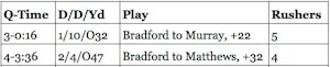 Now, let's look at what I think is the best feature on this entire page. My graphics and stats guy, John Daigle put together a throwing chart to show you where Sam Bradford's throws were going on Sunday. It was evident in both Week 1 and Week 2 that there is almost no vertical stretch from the Eagles. In fairness to the scheme, they did seem vertical back in 2013 (with DeSean Jackson, of course) and to a lesser extent in 2014. But, for reasons that are somewhat unclear, Bradford has shown almost no interest in throwing the ball down the field. Here is his chart from Sunday and as you can see, there is almost nothing more than 5 yards down the field: