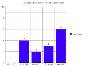3 and outs were something the Cowboys avoided with great ease in 2014. They finished 3rd in the NFL (Miami and Green Bay were #1 and #2) when they had their full compliment of weapons, but with each week another weapon disappears (Lance Dunbar is the latest) and the 3-and-outs start stacking up. They are now 30th in the league (Philadelphia - up tempo 3 and outs! - and Buffalo are #31 and #32) in 2015 and stacked up 6 more of them against the Patriots.
