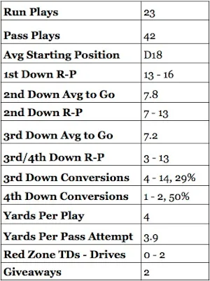 Next, notice the 3rd down conversions which are again too low (40% is what we need to be average, 50% is going to win most games). Then, the 2 numbers that we cannot work around - Yards Per Play at just 4 is never going to get it done and 2 more giveaways meaning the team was a "-2" and we know what that means. You lose.