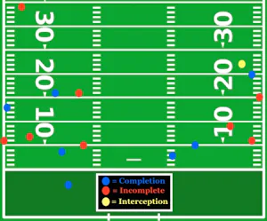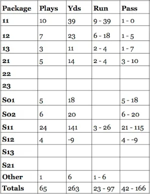 Here is the passing chart, this week featuring throws to the WRs on the field. 16 passes in all that generated 80 yards of offense. Just too much and not enough, if you know what I mean.