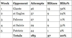 I think 1 blitz in 44 attempts is going to set a record. Check out how it compares with the other games this season. Atlanta and New England have come to the same conclusions, get Weeden by covering where he likes to throw and make him find someone elsewhere.