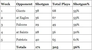 Here are the shotgun numbers for the week, which of course are a result of being behind for the entire 2nd half and needing to generate offense quickly.