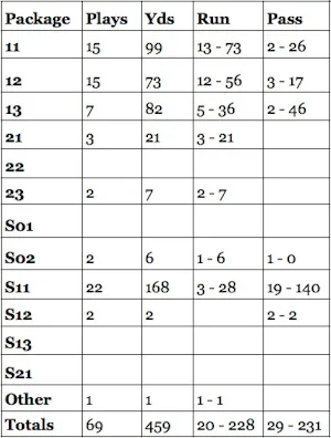 Now, let's take a look at how they put the troops in place. As I mentioned, there was a clear emphasis on multiple tight ends in this game and if you add up the number of times they used 12 and 13 personnel from under center, you will see it was easily a season-high in New York.