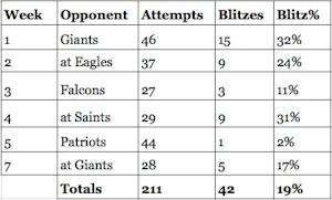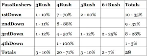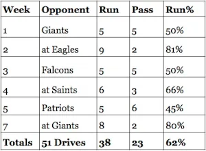 I think this is worth looking at. Why do we want to pass on early downs? Because, teams start sending big numbers on 3rd down. The Giants don't bring much pressure usually, but a few times, they tried to cross Matt Cassel up and frankly, it worked.