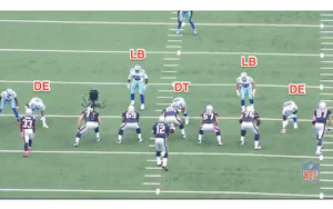 And tactically, they made some interesting modifications and adjustments to their defense to surprise the Patriots. I think the wrinkles in the defense indicate a much more aggressively coached unit than what the offense is offering these days. And when Greg Hardy was added, you could see Marinelli had ideas under the tarp that he was excited to unleash. Above, at the top of this story, you can see the wrinkle of a 3-2 front on nickel downs with both Rolando McClain and Sean Lee on the field on 3rd and 10. This allows McClain to rush (or not) and to pick a gap on the run and it certainly suits stunts, games, and the element of confusion for an offensive line on how to get to those guys. And the confusion was evident here early in the game.