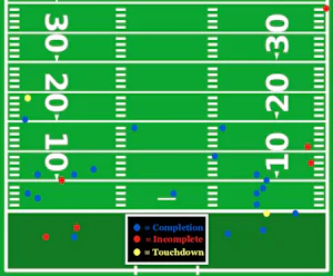 Speaking of that, here is the Tom Brady "throw chart" with the coordinates of each of his passes, with the two touchdowns in yellow and the completions in blue. To the surprise of nobody, they almost never go downfield. It is a series of horizontal passes into space that slowly kill you with high-probability passes that are often completed without danger of an interception.