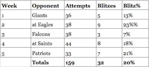 Now, here are the blitz rate numbers for the season on a weekly basis and the results are exactly what Marinelli wants - 20%: