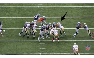 As you can see, we have linebackers talking and Brees trying to get into a quick snap. Watch where he goes with the ball: