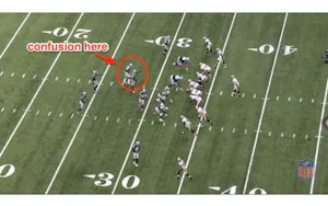 The first here is the pick play that injures Gachkar. The NFL won't call this very often, so teams run it constantly. It is worth 1 Offensive Pass Interference a game if you can get this play to hit 10 times. And that is why the good teams keep doing it.