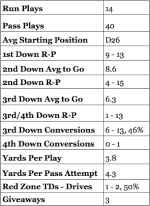 Looking back at the game requires multiple views - the first view is the angle of how poorly the performance was from Romo. You would be hard pressed to find him play a more ineffective game in his 127 career starts. There are many ways to easily suggest that there were extenuating circumstances that resulted in this performance, but nevertheless, he was really at his all-time worst. And for that reason, it is almost impossible to evaluate any other components of the game. Romo's 1st half performance destroyed any chance for the team to have a chance to win that game and the details of the Cowboys game-plan for Thursday were never revealed after he threw 3 interceptions in the first half - with 2 of them run all the way back for touchdowns and the other resulted in an easy field goal.