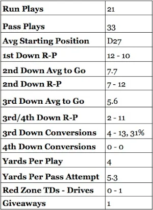 This game was a complete inability to sustain drives and to generate any sort of rhythm. This comes from running the ball with complete ineffectiveness to the tune of 21 runs for just 42 yards. They could not get anything done and while much of the praise was assigned to Darren McFadden during his 3-week run of success, now many of his runs on Sunday looked like a RB who did not have just a whole lot of decisiveness or burst.