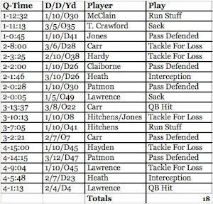 This was a strong week for splash plays. Lots of solid individual efforts over the course of the game with a season-high 18 splash plays awarded out. It is impossible to watch the defense play and fly to the ball on Sunday and question the effort. The results aren't perfect, but there is a fantastic amount of effort being spilled every week. Forgive me, but I really detest those who suggest this team has "checked out". The evidence doesn't agree. It is just that winning is really hard.