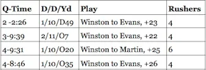 If nothing else, Winston keeps it interesting and is throwing it all over the field. When he sees a blitz, he is looking up top. And why not? If Evans doesn't catch it, it seems he is drawing a penalty.