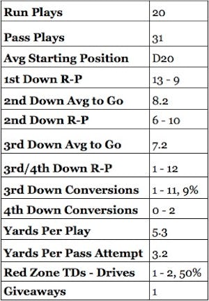 Well, there is a lot to unpack here, but the thing that jumps out quickly to me is the 3rd and 4th down conversions which at 1 for 13 combined indicates that you were likely blown out in the game.