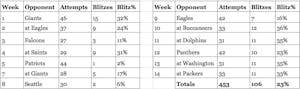 Word spreads in the NFL. If you struggle to beat blitzes, then the next team does it, too. And the next team. And so on. Look at Week 10 through 14. The word is out.