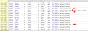The stretch that had me wondering was the 3 in a row (marked with the red arrows) in Arizona (in that game best noted for Garrett being accused of icing his own kicker with a timeout), at the end of the very damaging 2011 Sunday night home loss to the Giants (Miles Austin loses the ball in the lights) and then the October 2012 kick in Baltimore (best remembered for the poor game management at the end) against the Ravens.