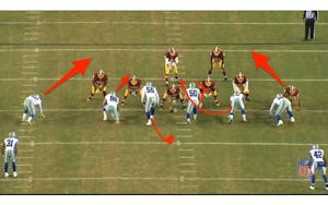 So let's look at the front 6 from the Cowboys and see how it works. They have 2 defensive ends wide and 2 defensive tackles wide, too. Now, back to the sugaring LBs. The Redskins have no idea what the plan is. The Cowboys can send McClain, Lee, both, or neither. Washington has to be prepared for all 4 possibilities. The center and the RB have to coordinate who has who which in most cases means the center takes the LB opposite the RB. In this case, the center has McClain, the RB takes Lee. Pretty plain and simple.